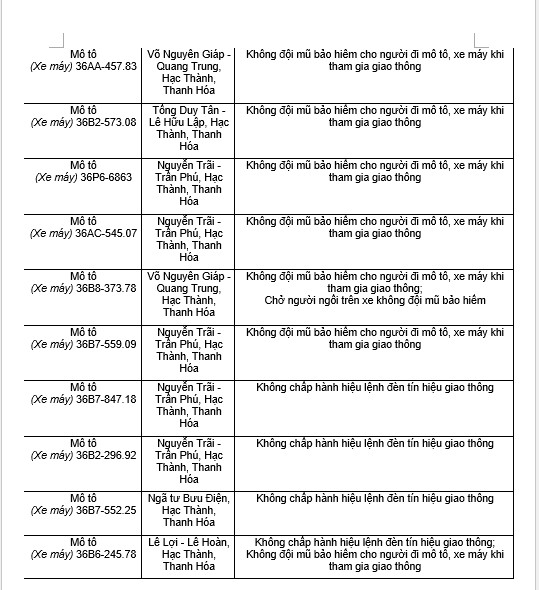 Trước đó, Công an Thanh Hoá thông báo kết quả phát hiện phương tiện vi phạm về trật tự an toàn giao thông qua hệ thống camera giám sát an ninh trật tự, an toàn giao thông từ ngày 11.10.2025 đến ngày 20.10.2025. Đáng chú ý trong số này có các biển số xe máy bị phạt nguội như sau: