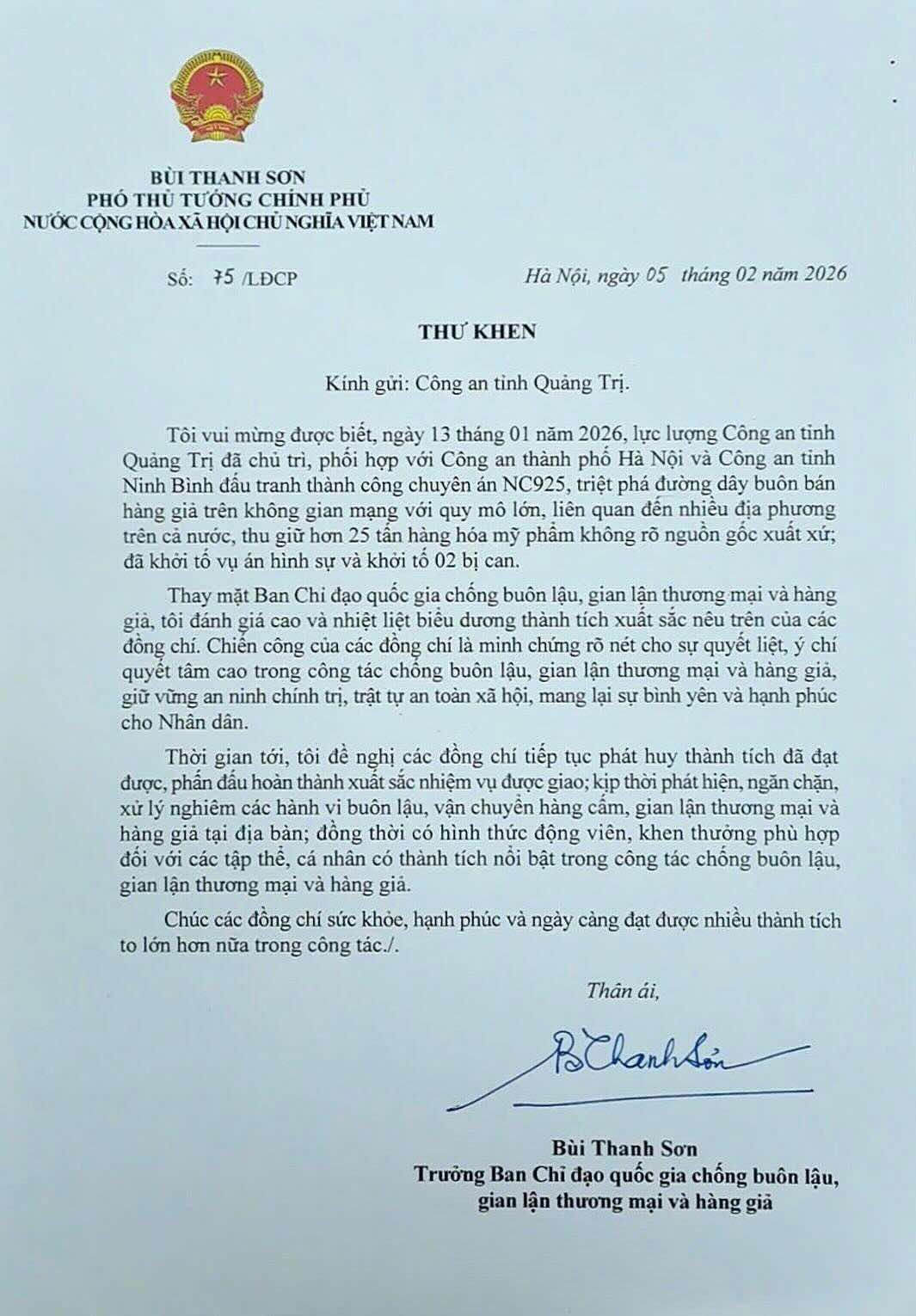 Theo nội dung thư, ngày 13.1.2026, Công an tỉnh Quảng Trị đã chủ trì, phối hợp với Công an thành phố Hà Nội và Công an tỉnh Ninh Bình đấu tranh thành công chuyên án NC925, triệt phá đường dây buôn bán hàng giả trên không gian mạng với quy mô lớn, liên quan đến nhiều địa phương trên cả nước, thu giữ hơn 25 tấn hàng hóa mỹ phẩm không rõ nguồn gốc xuất xứ; đã khởi tố vụ án hình sự và khởi tố 2 bị can.