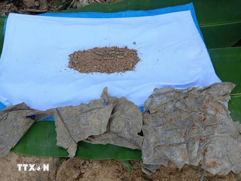 Di vật được Đội K53 tìm thấy cùng hài cốt liệt sỹ. (Ảnh: TTXVN phát)Ngày 20/1, thông tin từ Bộ Chỉ huy Quân sự tỉnh Quảng Ngãi cho biết, trong thời gian từ ngày 12-19/1, Đội K53, Bộ Chỉ huy Quân sự tỉnh Quảng Ngãi đã tìm kiếm, quy tập thêm được 5 hài cốt liệt sỹ tại Lào và Campuchia.