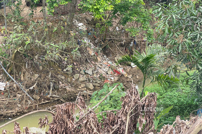 Không chỉ có nguy cơ gây ô nhiễm môi trường, việc đổ thải cạnh suối có thể làm thu hẹp dòng chảy, gây ngập lụt mùa mưa lũ. Ảnh: Đinh ĐạiQuan sát thực tế cho thấy, một số đoạn nước chảy chậm, chuyển màu đục, bốc mùi nhẹ. Những điểm bị lấn chiếm có dấu hiệu trở thành “nút thắt”, tiềm ẩn nguy cơ cản trở dòng chảy khi mưa lớn.