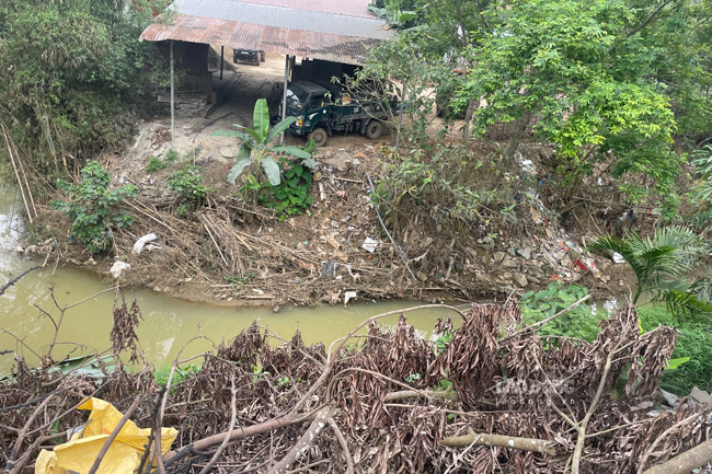 Đáng chú ý, không ít vị trí xuất hiện các bãi đổ đất, phế thải xây dựng lấn sát lòng suối, khiến dòng chảy bị thu hẹp.