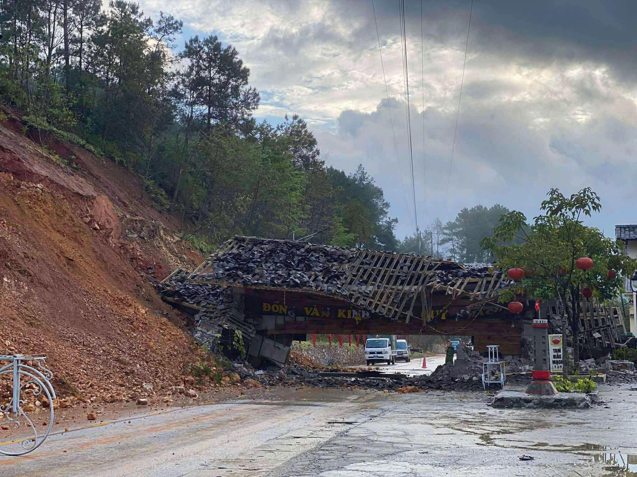 Ông Phạm Đức Nam, Chủ tịch UBND xã Đồng Văn, xác nhận cổng chào xã bị sập, gãy đôi do sạt lở đất lúc 7h. Nguyên nhân ban đầu được xác định là lượng nước tích tụ trong hai đợt bão liên tiếp số 10 và 11 khiến hàng nghìn m3 đất đá từ đỉnh núi sạt trượt.