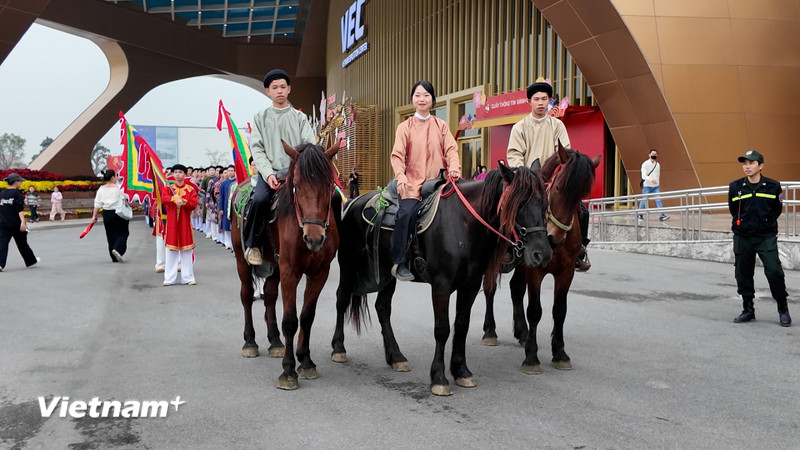 Hình ảnh đoàn kỵ binh uy nghi dẫn đầu, theo sau là những tà áo dài tung bay giữa không gian kiến trúc hiện đại của VEC tạo nên một hiệu ứng thị giác mãn nhãn.