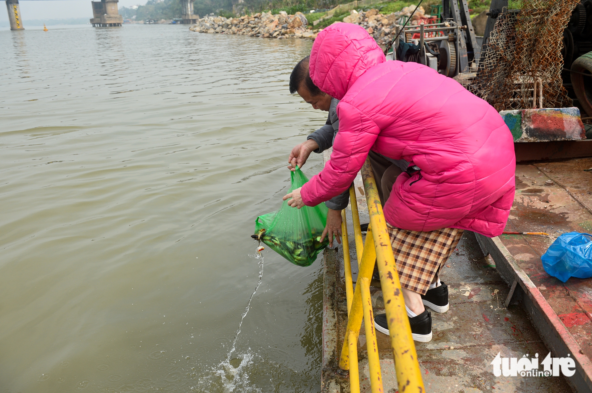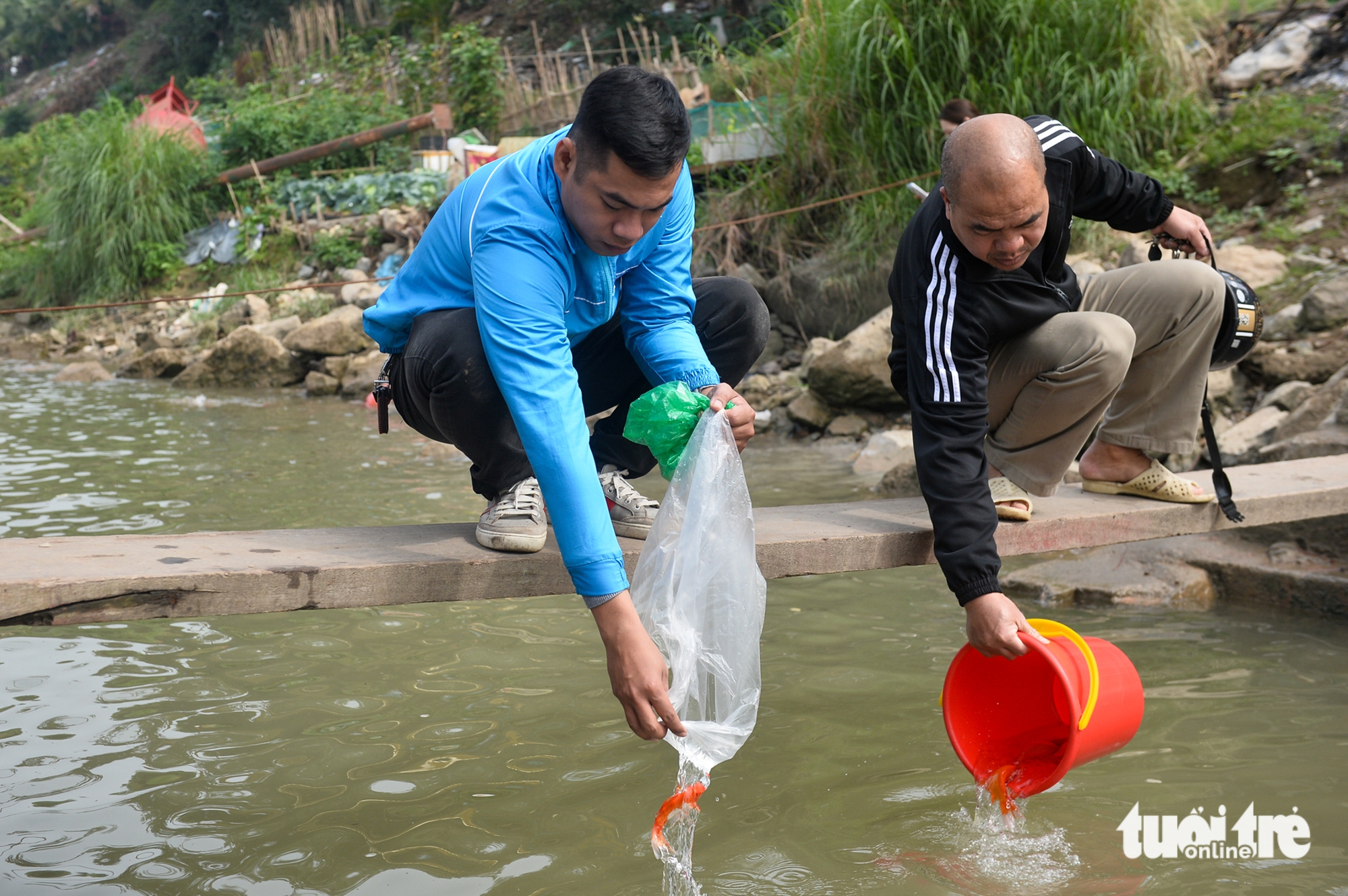 Anh Phạm Hùng Cường - Phó bí thư Đoàn TNCS Hồ Chí Minh phường Bồ Đề (Hà Nội) - hỗ trợ người dân thả cá xuống sông Hồng - Ảnh: PHÚC TÀITheo ghi nhận của Tuổi Trẻ Online, trưa 10-2 (23 tháng chạp) có rất đông người dân tới các khu vực ven bờ sông Hồng, hồ Tây (Hà Nội) để thả cá chép.