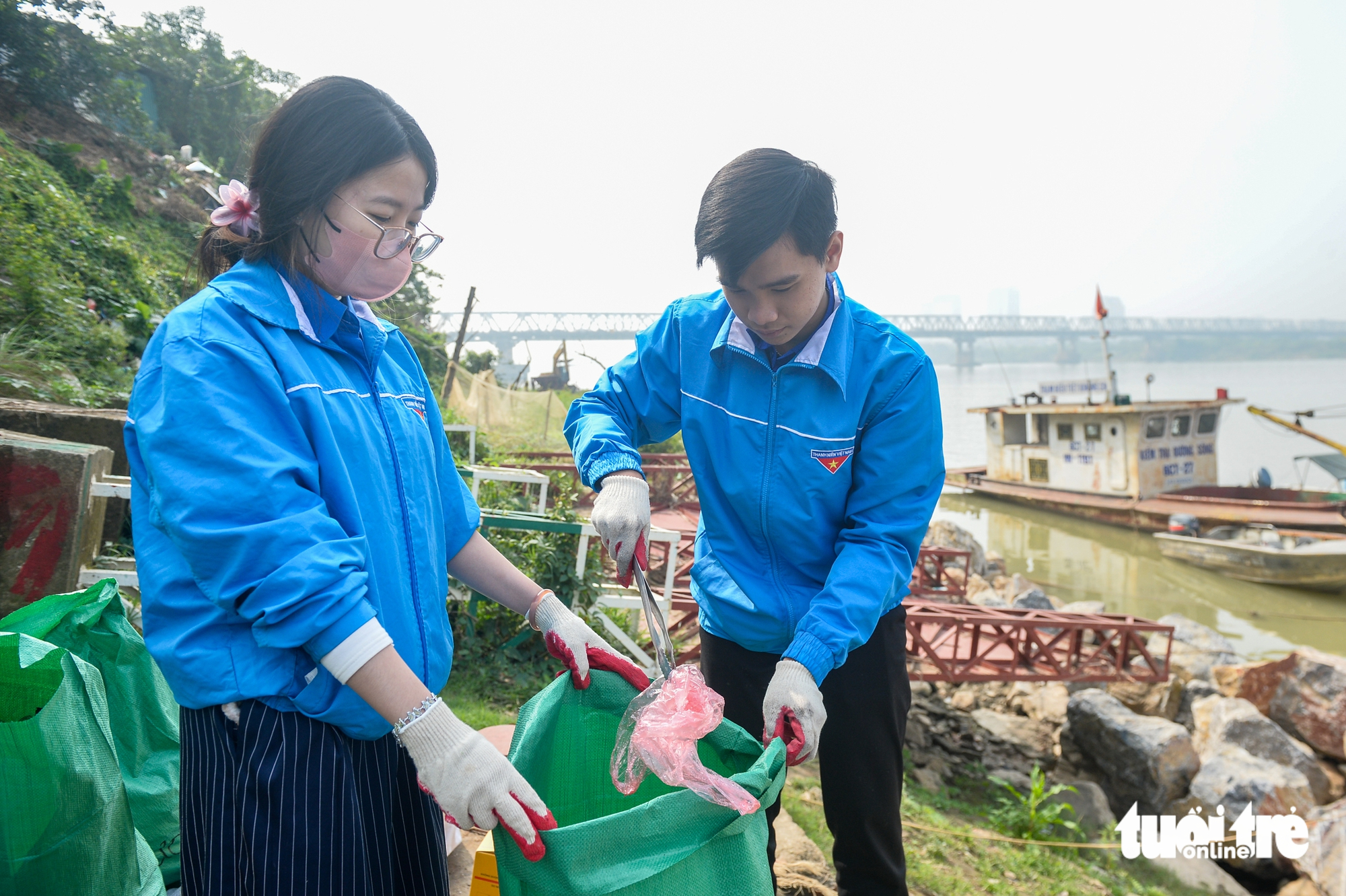 Tại khu vực bờ sông Hồng đoạn qua làng ẩm thực Ngọc Lâm, Đoàn TNCS Hồ Chí Minh phường Bồ Đề (Hà Nội) đã cử các bạn đoàn viên túc trực để hỗ trợ người dân thả cá, đồng thời nhắc nhở người dân không ném túi ni lông xuống sông.