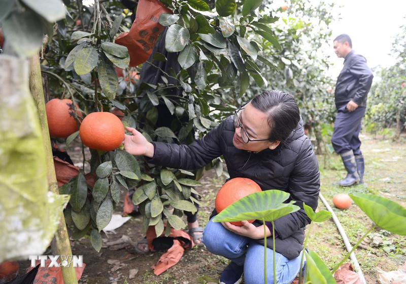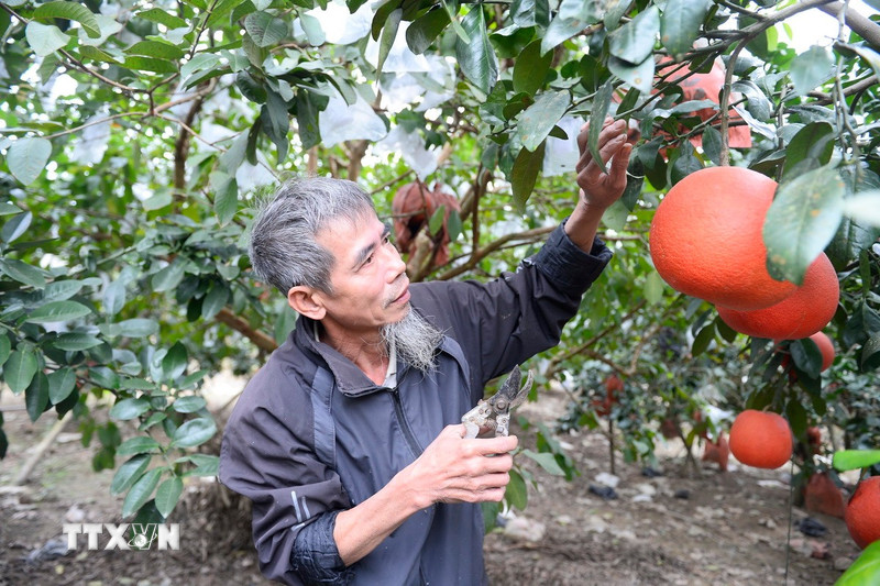 Ông Nguyễn Văn Tư chăm sóc vườn bưởi. (Ảnh: Hoa Mai/TTXVN)Được xem là một biểu tượng của sự may mắn, tài lộc và thịnh vượng, bưởi đỏ Luận Văn hay còn có tên gọi khác là bưởi tiến Vua (làng Luận Văn, xã Lam Sơn, tỉnh Thanh Hóa) là thức quả được nhiều người ưa chuộng mỗi dịp Tết đến Xuân về.