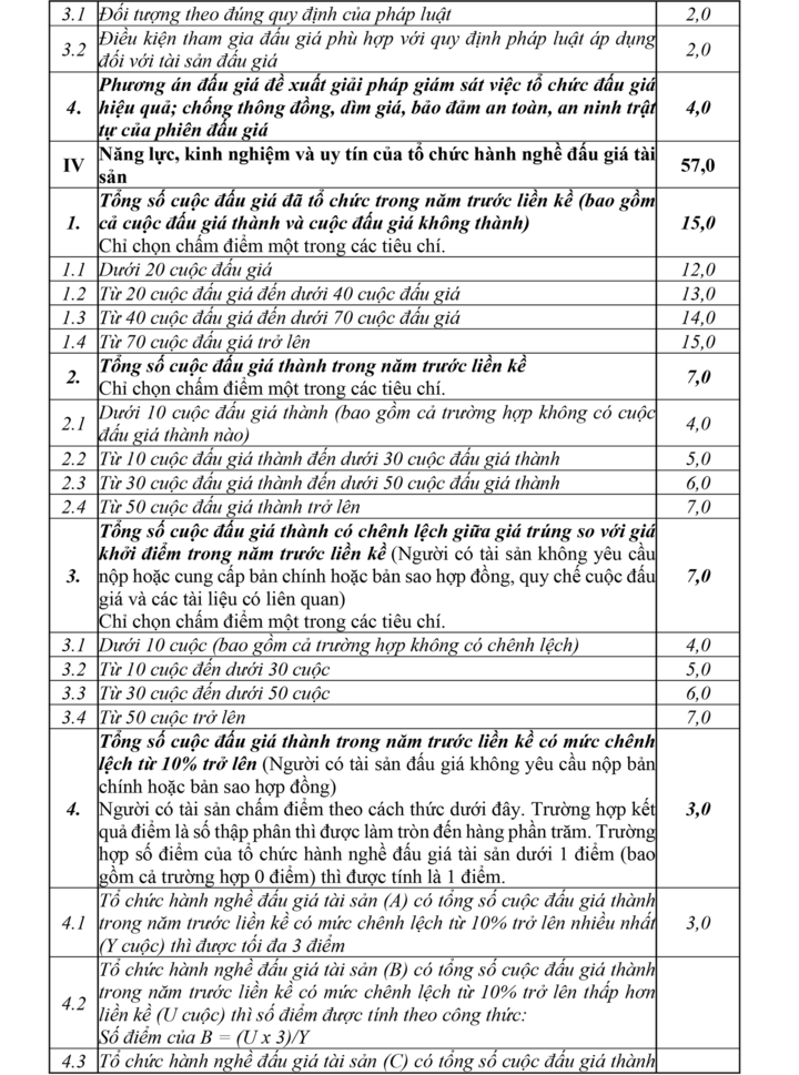 - Tiêu chí bắt buộc: Có tên trong danh sách tổ chức hành nghề đấu giá công bố tại cổng đấu giá tài sản quốc gia của Bộ Tư pháp. Trường hợp không đạt tiêu chí bắt buộc thì bị đánh giá là Không đạt và bị loại.