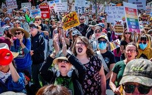 Một người biểu tình hóa trang hình tượng Nữ thần Tự do để hưởng ứng những cuộc xuống đường “No King” chiều 28-3 của hàng triệu người khắp nước Mỹ và nhiều thành phố lớn trên thế giới. Tấm biểu ngữ mang theo nhắc rằng nước Mỹ đã độc lập, không có vua từ năm 1776 (Ảnh: AP)