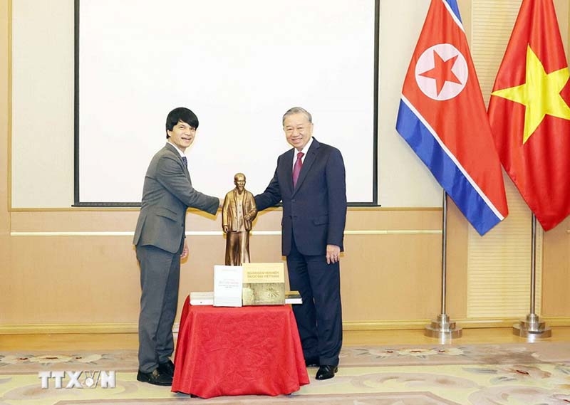 Tổng Bí thư Tô Lâm tặng bức tượng Chủ tịch Hồ Chí Minh và sách cho Đại sứ quán tại Triều Tiên. (Nguồn: TTXVN) |