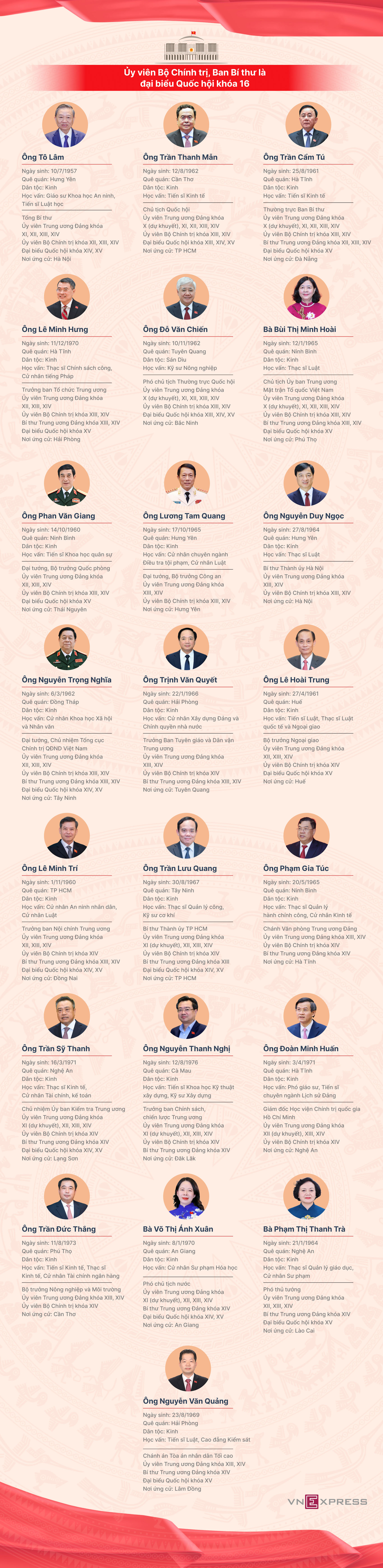 Theo danh sách công bố chiều 21/3, Tổng Bí thư Tô Lâm cùng các Ủy viên Bộ Chính trị và Ban Bí thư ứng cử đều trúng cử đại biểu Quốc hội khóa 16.