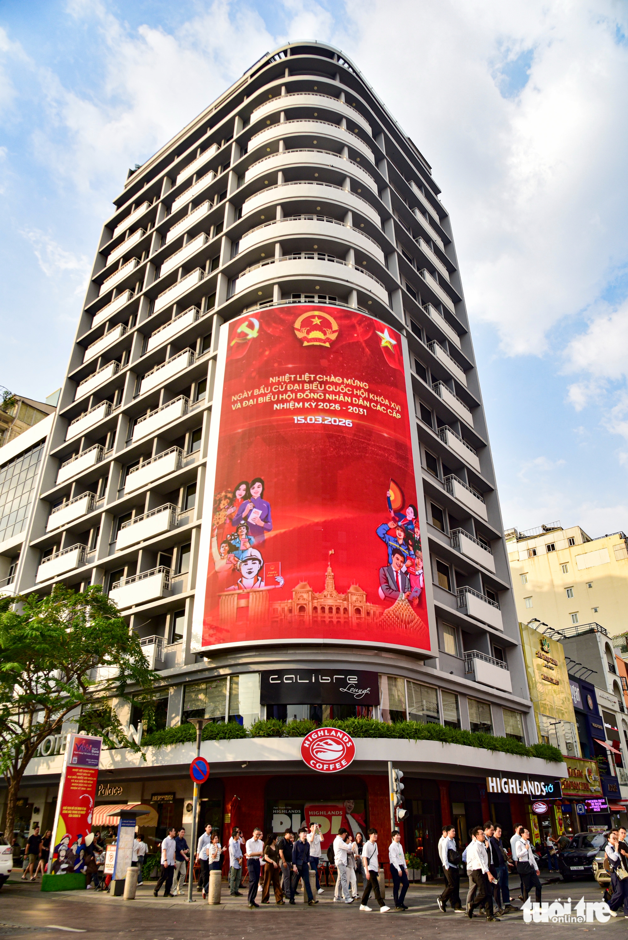 Một tòa nhà tại khu vực phố đi bộ Nguyễn Huệ (phường Sài Gòn) gây ấn tượng với màn hình led lớn, tuyên truyền về sự kiện chính trị trọng đại của đất nước