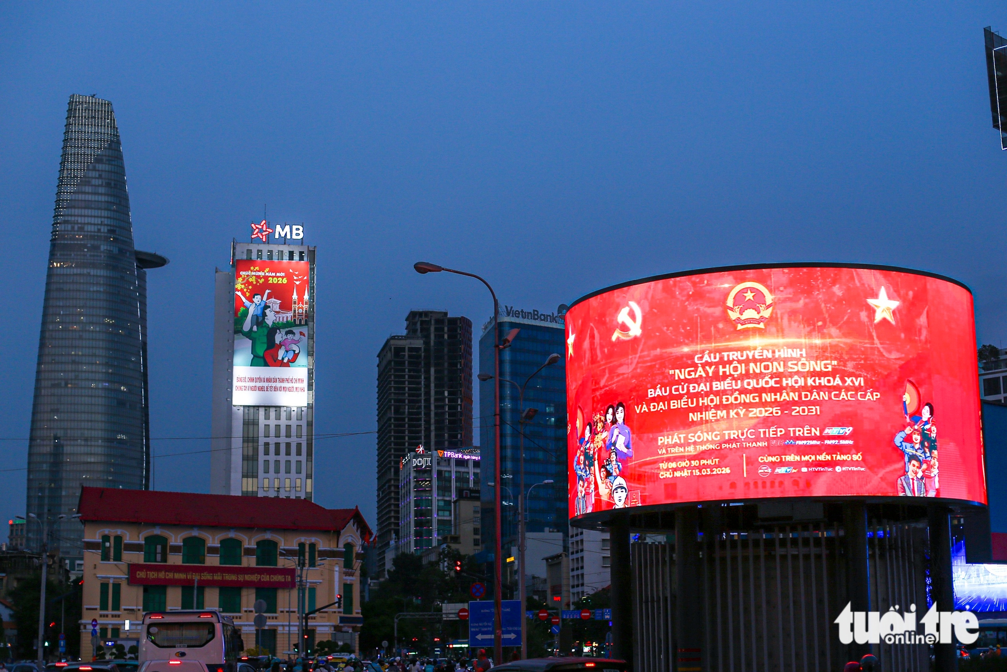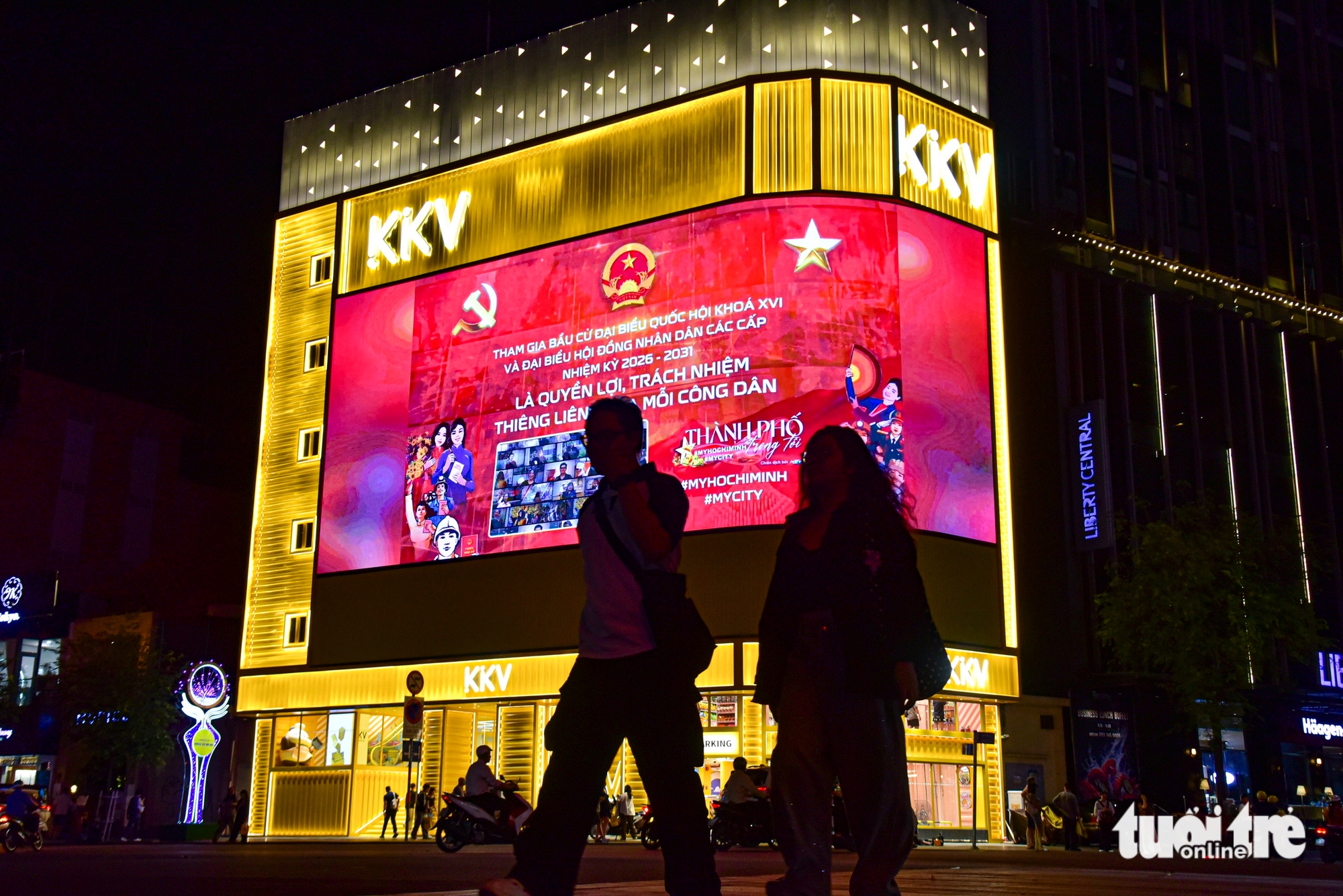 Phố đi bộ Nguyễn Huệ như được trang hoàng rực rỡ với nhiều màn hình led tuyên truyền về cuộc bầu cử đại biểu Quốc hội khóa XVI và đại biểu HĐND các cấp nhiệm kỳ 2026 - 2031