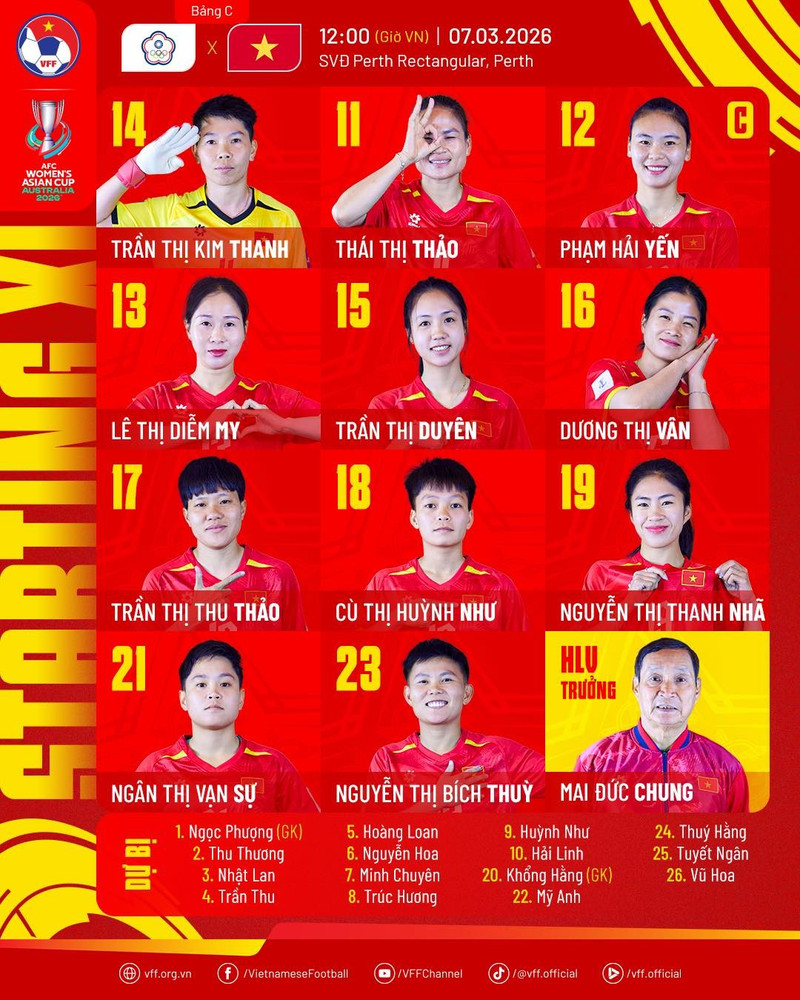 Huỳnh Như dự bị trận này. Hải Yến sẽ đá chính ở vị trí mũi nhọn. Ngoài ra, đội không có bất cứ thay đổi nào so với trận gặp Ấn Độ.