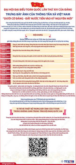 Trưng bày ảnh gồm khoảng 500 bức ảnh tư liệu của TTXVN, được chia thành 8 phần, giới thiệu những dấu mốc tiêu biểu trong các giai đoạn của Cách mạng Việt Nam gắn với các kỳ Đại hội của Đảng./.