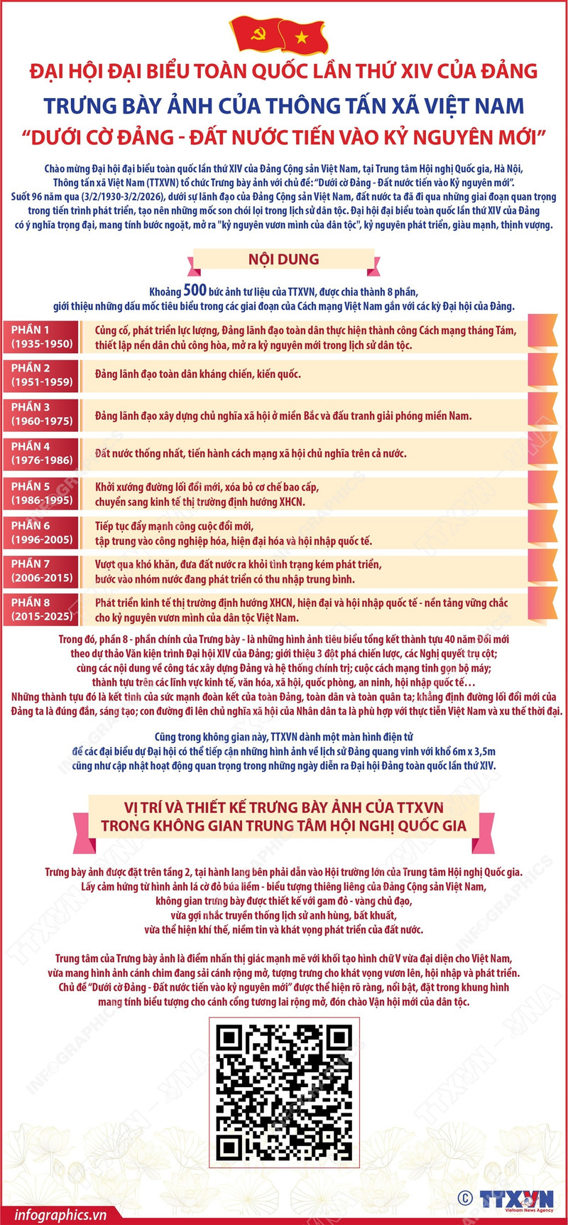 Chào mừng Đại hội đại biểu toàn quốc lần thứ XIV của Đảng Cộng sản Việt Nam, tại Trung tâm Hội nghị Quốc gia, Hà Nội, Thông tấn xã Việt Nam (TTXVN) tổ chức Trưng bày ảnh với chủ đề: “Dưới cờ Đảng - Đất nước tiến vào Kỷ nguyên mới.”