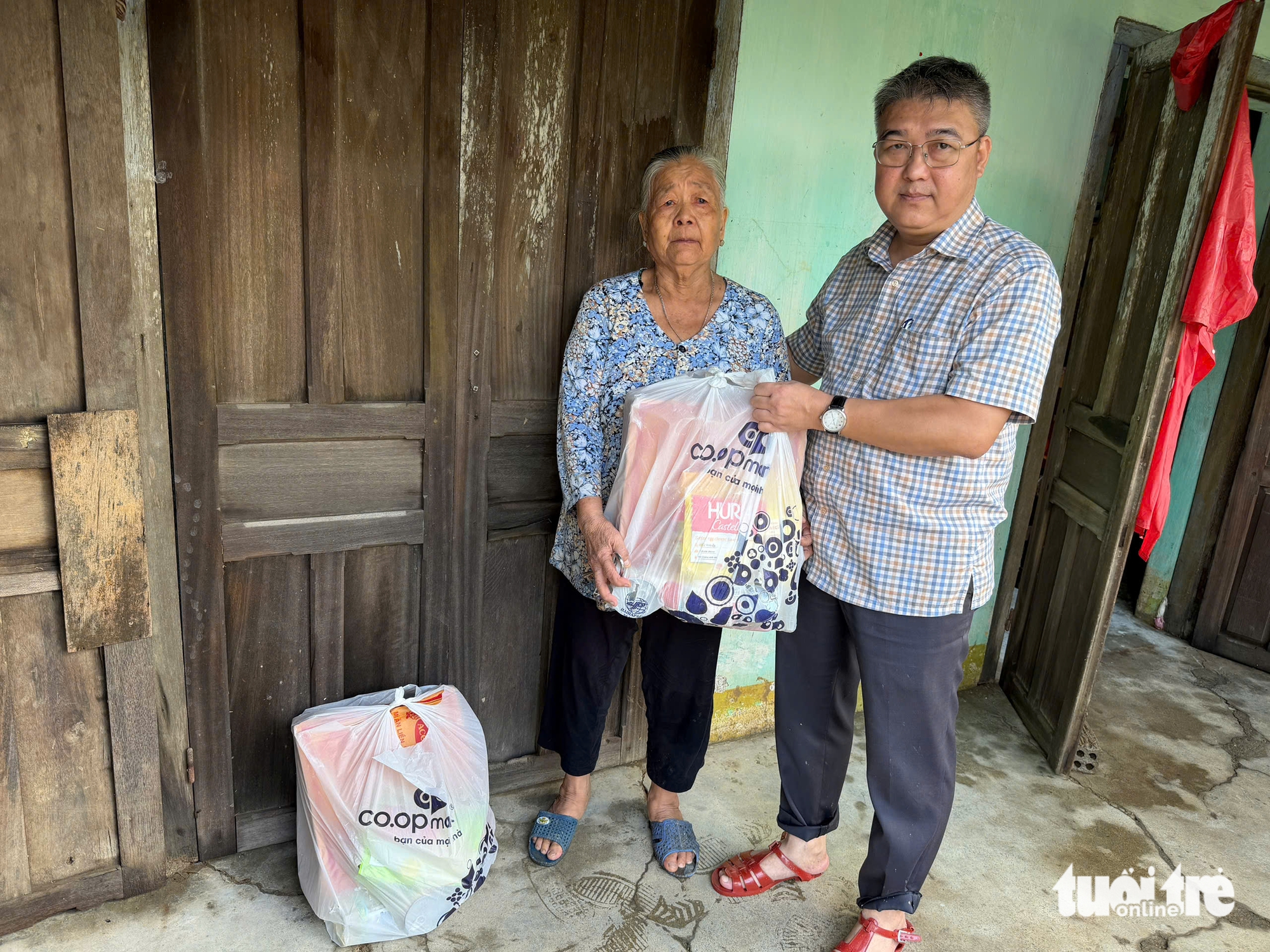 Ông Lê Văn Thìn - Bí thư phường Đông Hòa - trao phần quà của Đảng ủy, chính quyền phường và báo Tuổi Trẻ cho bà Nguyễn Thị Sen