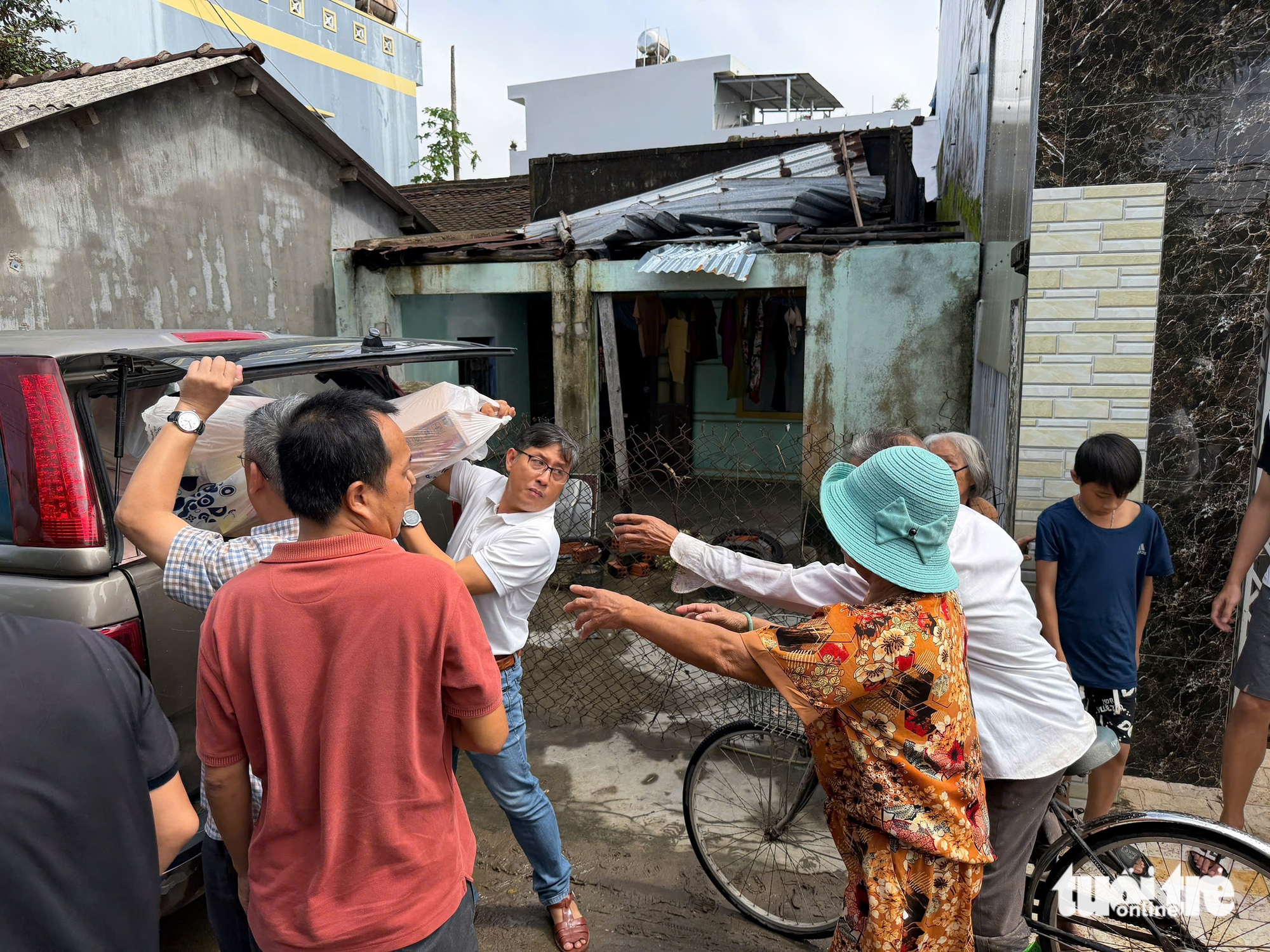 Bí thư phường Đông Hòa Lê Văn Thìn đi cùng đoàn cứu trợ, tới các khu dân cư, vào các nhà dân thiệt hại nặng, neo đơn để trao các phần quà khẩn cấp.