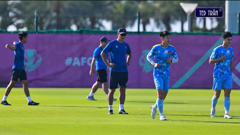 Báo điện tử Tiền Phong Đình Bắc chạy bộ nhẹ nhàng cùng bác sỹ Lê Huy Thọ. (Ảnh: Tedtran TV) 1Vì chỉ còn hai ngày để tập luyện, HLV Kim Sang-sik chỉ phát biểu ngắn gọn, phổ biến một số yêu cầu trong buổi tập trước khi bắt đầu ngay. Chiến lược gia người Hàn Quốc đã có mặt trên khán đài tối ngày 13/1 để theo dõi trận hòa của U23 Syria và U23 UAE, đối thủ ở trận tứ kết. Khi trở về, hẳn ông đã rút tỉa, phân tích các điểm mạnh yếu và đề ra kế hoạch chi tiết. Buổi tập hôm nay chính là một phần của kế hoạch.