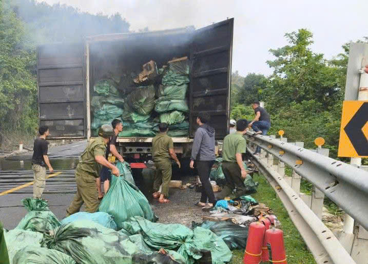 Phát hiện khói đen bốc lên từ thùng xe, tài xế Tuyển lập tức đánh lái tấp xe vào lề đường, gọi điện báo lực lượng chức năng.