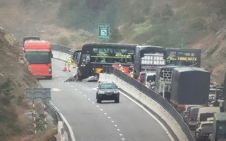Tại hiện trường, chiếc xe khách gặp nạn nằm chắn ngang làn đường hướng Nam - Bắc, khiến dòng xe phía sau phải dừng lại, giao thông qua khu vực bị tê liệt trong một khoảng thời gian.