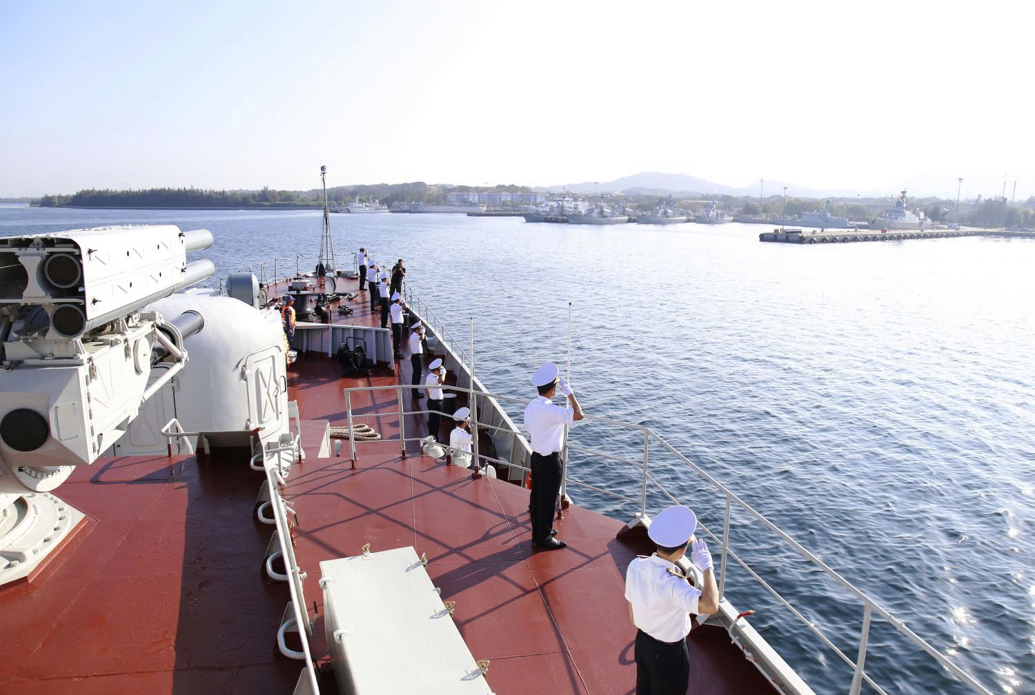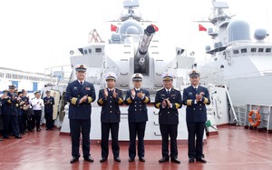Tàu Hải quân hai nước chào nhau trên biển sau khi hoàn thành nhiệm vụ tuần tra, huấn luyện liên hợp trên vùng biển Vịnh Bắc Bộ