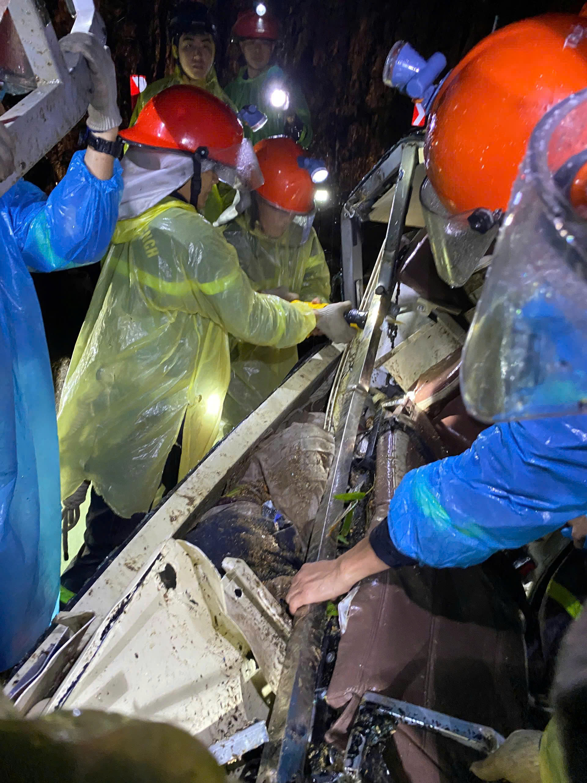 Lực lượng cứu hộ đang cứu hộ người mắc nạn trong xe khách