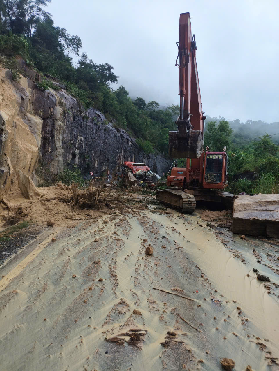 Hiện trường xảy ra vụ sạt lở trên đèo khánh Lê (tỉnh Khánh Hòa) khiến đất đá đổ vào xe khách - Ảnh: Khu quản lý đường bộ IIITheo ghi nhận, hiện tuyến quốc lộ 27C dẫn lên đèo Khánh Lê đang có mưa rất lớn, nhiều khu vực ngập sâu.