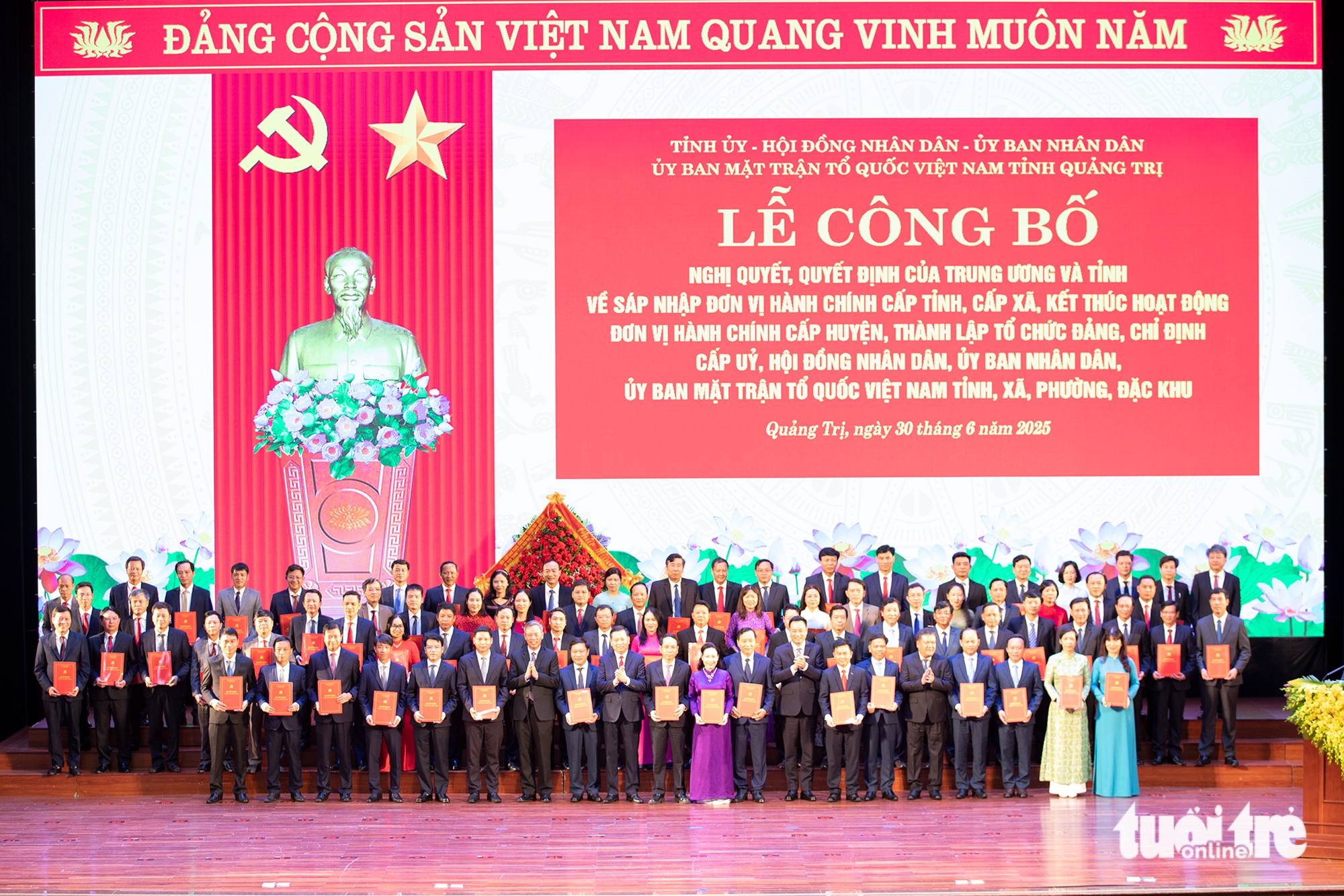 Thường trực Tỉnh ủy Quảng Trị - Ảnh: HOÀNG TÁOSáng 30-6, tại thành phố Đồng Hới (Quảng Bình), Tỉnh ủy, HĐND, UBND, Ủy ban MTTQ Việt Nam tỉnh Quảng Bình và tỉnh Quảng Trị long trọng tổ chức lễ công bố các nghị quyết, quyết định của Trung ương và của tỉnh về sắp xếp tổ chức bộ máy và đơn vị hành chính cấp tỉnh, cấp xã, kết thúc hoạt động cấp huyện, thành lập tổ chức đảng, chỉ định cấp ủy, HĐND, UBND, Ủy ban MTTQ Việt Nam tỉnh và xã, phường, đặc khu thuộc tỉnh Quảng Trị.